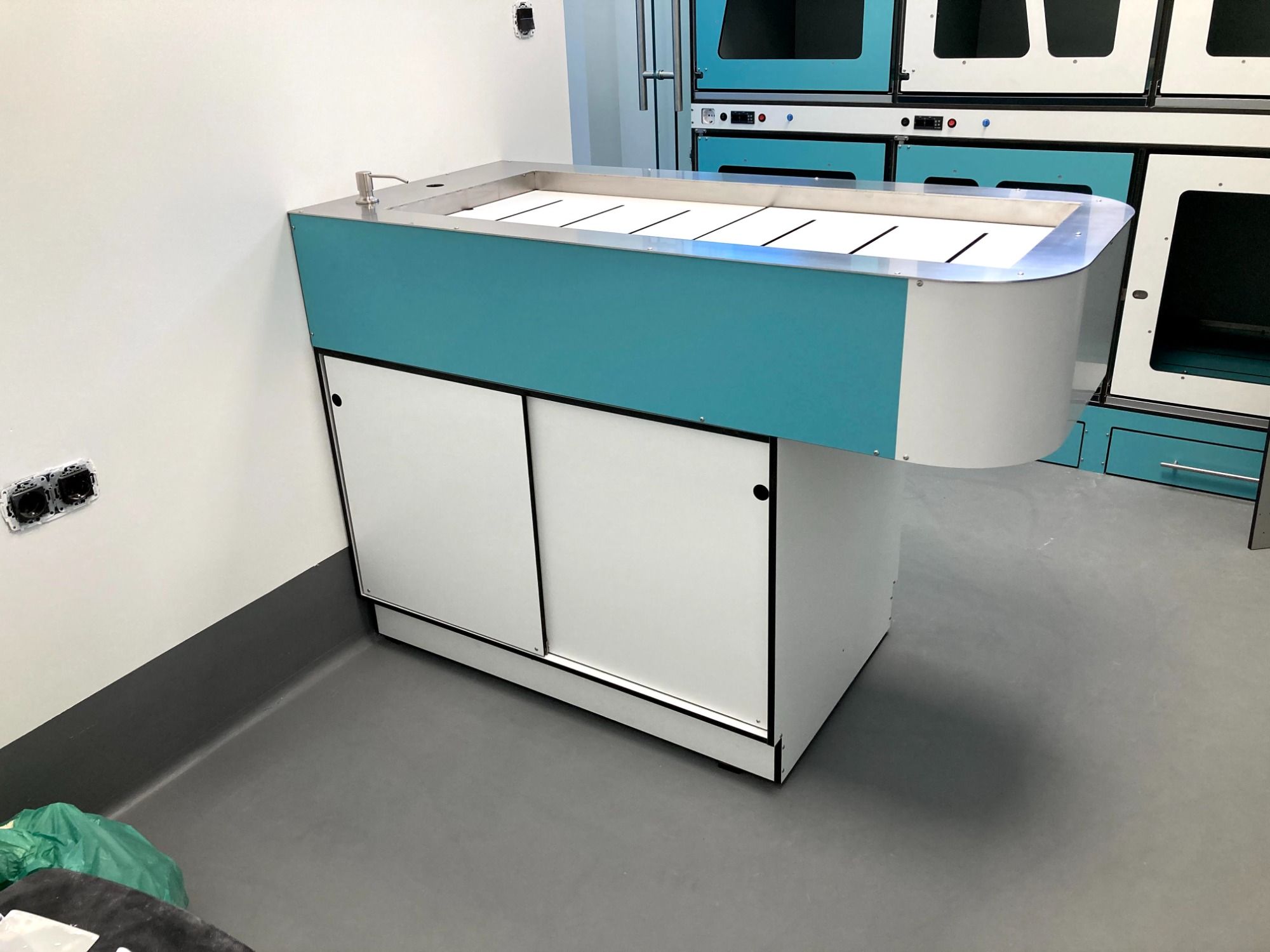 “Doble puesto de bañera de prequirófano fabricado en resina y acero inoxidable. Con cajones de almacenaje en ambos lados, pileta central integrada en voladizo y bandeja superior configurable. En LINVET diseñamos y fabricamos a medida, personalizando colores, acabados y configuraciones según las necesidades de cada cliente. Danos vuestras medidas y os hacemos un proyecto personalizado.”