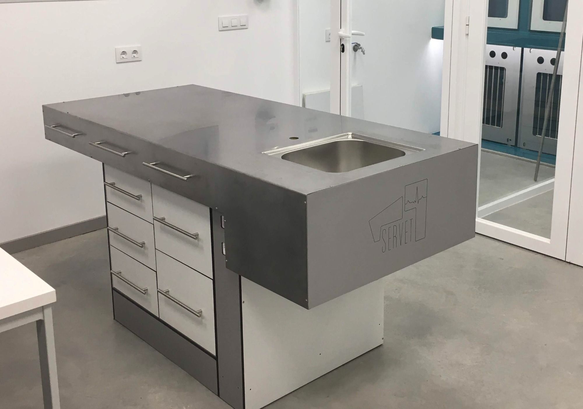 Esta estación de trabajo doble combina bañera prequirófano y mesa de trabajo con barandillas retráctiles, especialmente diseñadas para proteger a los animales sedados y evitar caídas durante los procedimientos.